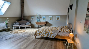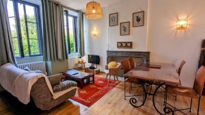 Idéal pour se ressourcer, gîte rénové avec goût dans une maison de caractère, mitoyen à celle des propriétaires, comprenant : cuisine équipée, salon-salle à manger. Salle d'eau (douche à l'italienne). WC. À l'étage : grande chambre familiale, avec deux espaces couchages: 1 lit (2pers), 2 lits (1pers). Draps fournis et lits faits à l'arrivée. Sur l'arrière de la maison, grand parc arboré, avec piscine (commune aux propriétaires), terrasse privative avec pergola, transat, salon de jardin, barbecue privatif au gîte, et sans vis à vis. Cour gravillonnée. Terrain clos. Salle de Fitness. Sauna . Piscine: 9X4.5m, (disponible de mai/juin à mi septembre, en fonction de la météo). Vélos à disposition. Chauffage électrique. CHARGES NON COMPRISES. Accès Internet avec box dans le gite. Gîte Bien-Être: espace fitness, Sauna, et piscine !Animaux non admis.Charges et options : Ménage fin de séjour : 40€. Linge de toilette : 5€ par personne. Charges non comprises.