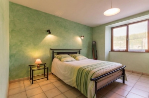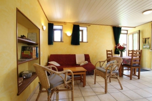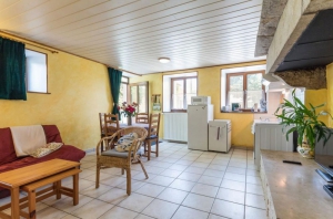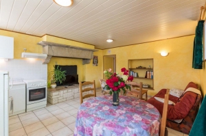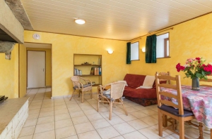 À la sortie du village, au calme, un gîte, confortable de plain-pied, sans vis-à-vis (partie de la maison des propriétaires), avec cour gravillonnée et close devant le gîte, comprenant : séjour/coin cuisine/coin salon avec TV écran plat, (canapé convertible 2 personnes), 1 chambre (1lit 2pers-1 bébé sur demande). Salle d'eau/WC. À disposition : matériel bébé. Cour privative gravillonnée et close devant le gite. CHARGES COMPRISES. Accessible personnes à mobilité réduite (douche et WC). Options : Forfait ménage : 60€ - Draps : 6€/lit