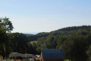 Avant le village du Bouix, en arrière-plan, les monts du Cantal ; ce massif est en fait le vestige d’un stratovolcan né il y a 13 millions d’années, le plus grand d’Europe, démantelé par des phénomènes d’effondrement et d’érosion glaciaire.