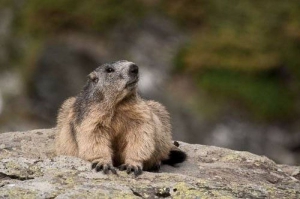 Animal de la famille de l'écureuil, la marmotte (Marmota marmota) occupe les alpages en petits groupes familiaux. Rongeur fouisseur, la marmotte aime les terrains meubles et ensoleillés avec une vue dégagée. Vigie des alpages, elle vous apercevra bien souvent avant que vous ne la voyez et signalera votre présence par un cri strident, à moins qu'elle ne veuille avertir ses congénères de l’arrivée d'un aigle ou d'un renard. Surtout ne la nourrissez pas ! Les aliments, inadaptés à ses besoins, nuisent à sa santé et à sa survie. En effet, la marmotte se nourrit exclusivement de plantes. Elle creuse des réseaux de galeries et de chambres dans lesquelles elle hiberne d'octobre à avril. Durant cette période, son cœur et sa respiration ralentissent, sa température baisse de 36°C à 8°C et elle vit sur ses réserves de graisse. Les marmottons naissent en juin à l'abri du terrier familial et ce n'est que début juillet que vous pourrez les observer. La journée d'une marmotte se compose de 3 activités principales : se nourrir, faire la sieste et jouer (pour les jeunes). Désespoir des agriculteurs du fait de ses capacités à creuser terriers et galeries, le Parc national a longtemps capturé des individus dans les prairies de fauche pour les réintroduire dans des territoires dénués d'agriculture.