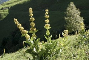 Parure de la montagne, la grande gentiane (Gentiana lutea) ne passe pas inaperçue avec ses fleurs jaunes. Elle peut atteindre 2 m de haut et vivre une soixantaine d'années !  Sa présence  indique que les pâturages sont bien équilibrés et excellents pour le lait des vaches. La gentiane est aussi une plante médicinale très connue : ses racines ont des propriétés toniques, digestives et dépuratives. Il ne faut pas confondre la gentiane avec le vératre blanc, très toxique. La distinction est facile : les feuilles de la gentiane sont positionnées de façon opposée alors qu'elles sont alternes chez le vératre.