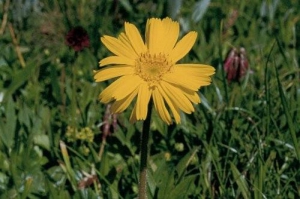Les pelouses sont parsemées de véritables petits soleils. L'arnica des montagnes (Arnica montana) ressemble à une marguerite jaune, un peu décoiffée. Ses propriétés médicinales sont connues depuis l'Antiquité. Ne la confondez pas avec le séneçon doronic ! L'arnica possède un feuillage à ses pieds, une rosette plaquée au sol.