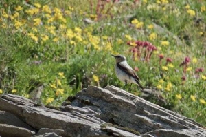 Petit passereau caractéristique de la pelouse alpine, le traquet motteux est facile à reconnaître par son croupion blanc et sa queue avec un T noir inversé. Le reste du plumage du mâle gris, blanc et ocre, tandis que celui de la femelle est beige uniforme. Souvent perché sur un rocher, il alarme en lançant des « ouit ouit » ou des « tchac tchac ». C'est un oiseau migrateur qui ne fréquente la Vanoise que durant les mois d'été avant de traverser le Sahara pour passer l'hiver en Afrique équatoriale.