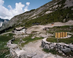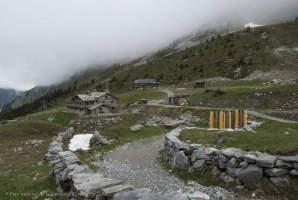 Le refuge des Barmettes matérialise la limite supérieure des pistes de ski de Pralognan-la-Vanoise, comme en témoigne au centre de l’image le télésiège débrayable du Génépi, installé durant l’été 2007. Le refuge fonctionne l’hiver davantage comme un restaurant d’altitude que comme un refuge au sens habituel du terme. En pleine modernisation aussi, les murs de façade du refuge attendent un nouveau parement en pierres et un bardage en bois. L'herbe a repoussé sur les talus du télésiège. Les pistes reverdies, outre qu’elles sont plus jolies, sont aussi plus faciles à damer. Plus à droite, une petite cabane en bois claire abrite les pisteurs et un poste de secours.