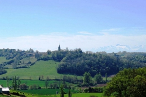 En chemin, profitez des nombreux points de vue sur les Pyrénées et la vallée de la Gesse.L'été, une légère brume de chaleur trouble l'horizon, mais on distingue très bien les hauts sommets.