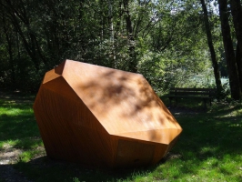 Ce rocher est taillé de multiples facettes dans l’acier Corten. Ce matériau rouillé par essence pour résister aux conditions atmosphériques est le fruit de l'innovation industrielle. En tendant l’oreille, l’œuvre nous conte l’histoire d’une nature séculaire. Basserode évoque ainsi les rapports, l’accord ou l’opposition entre la science et la puissance de la nature.