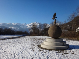 Un bouquetin et un gypaète barbu, animaux emblématique de nos montagnes, surmontent un globe en terre pour regarder vers la source de l'Arve et l’avenir. L'artiste franco-germanique, a voulu que cette œuvre et son socle circulaire soient un point de rencontre et de contemplation sur la route des marcheurs.