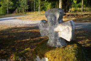 Cette croix bi-face de style populaire aux extrémités épatées porte sur une face une représentation du Christ en croix et sur l’autre vraisemblablement un ecce homo, représentation du Christ portant une couronne d’épines. A l’origine, elle devait être élevée sur un fût. A la croisée des chemins, il s’agit probablement d’une croix de carrefour qui avait pour fonction de protéger le voyageur à une époque où l’insécurité était omniprésente.