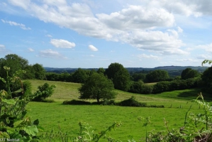 Depuis le pittoresque hameau de Chassagnat, découvrez une belle vue sur le château du Muraud et la campagne limousine, ainsi que différents villages comme le bourg de Masléon avec son église à côté d'un château d'eau.