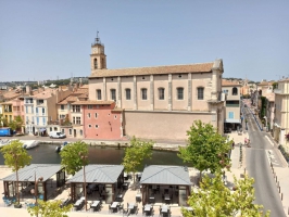 Construite entre 1670 et 1680, elle témoigne de la prospérité de la ville au XVIIe et de l'attachement des habitants de l'Ile qui participèrent à son financement.La façade présente deux niveaux séparés par une corniche volumétrique à modillons. Au premier niveau, une double colonnade encadre la porte en bois richement décorée, dominée par une Vierge de l'Enfant dans une niche sculptée. La statue et le portail sont classés Monument Historique depuis 1908. Les colonnes et les pilastres cannelés scandent la façade et sont surmontés de chapiteaux corinthiens. La corniche volumétrique ornée de modillons, rosaces et denticules, en ressaut au droit des pilastres et des colonnes, est interrompue par un fronton brisé entraînant des jeux d'ombres et de lumières. Le second niveau, plus classique, est simplement animé par des pilastres nus et couronné par un fronton triangulaire dont la sculpture date du XIXe siècle. A l'intérieur de l'église, la spacieuse nef unique à sept travées et chevet plat est couverte d'un plafond de bois compartimenté, conçu pour recevoir un décor peint jamais réalisé. Une corniche volumétrique reprenant la décor extérieur court le long des murs. A l'étage supérieur très sobrement décoré de pilastres et de chapiteaux épannelés, de grandes fenêtres inondent l'église de lumière.Dans le chœur, le maître-autel a bénéficie d'un décor de faux marbre et ses dorures s'apparente à l'autel de la chapelle de l'Annonciade. Il accueille le Saint-Sacrement. Un grand tableau de la Crucifixion du XIXe siècle s'impose dans le décor en forme de baldaquin. La chaire en noyer a été réalisée par le maître menuisier martégal Etienne Darbon qui en a fait don à l'église en 1679. L'orgue de tribune, construit vers 1850 par Prosper Antoine Moitessier, est situé au dessus du porche d'entrée de l'église. Le buffet, classé monument historique en 1908, est d'inspiration italienne, les riches ornements dorés à la feuille, reprennent des éléments de décors de l'édifice. La partie instrumentale est dans le style français de l'époque avec 26 jeux, répartis sur 2 claviers ainsi que des pédaliers et 1500 tuyaux.Les confréries commandaient des tableaux d'autel pour leur chapelle et constituait une clientèle importante pour les artistes. Deux œuvres méritent une attention particulière : - "Martyre de Sainte Catherine d'Alexandrie" par Jean Baptiste Daniel (vers 1636-1720). Cette toile fût transférée dans l'église en 1892 et classée en 1957. Sur les pans coupés du chœur de l'église, on retrouve la suite du martyre de la Sainte. Le traitement en contre-plongée, les contrastes lumineux les attitudes accentuent le mouvement des figures et confèrent à cette œuvre dynamisme et puissance. - "Saint-Honoré, Saint-Antoine, Saint-Michel" réalisé en 1694 par Michel Serre et commandé par la riche confrérie des boulangers. La campagne de restauration de 15 ans fut primée par le ruban du patrimoine en 2000.