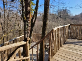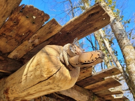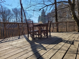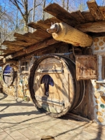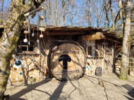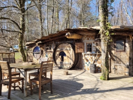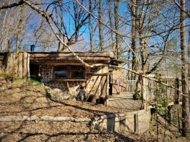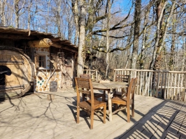 Le Terrier est une cabane semi-enterrée cachée dans la forêt et surplombant une prairie. Fraîche même en été et avec son poêle à bois l'hiver, vous vous sentirez tout en sécurité. Construite en bois cordé et chanvre/chaux, ses 3 puits de lumière éclairent son intérieur rustique et confortable et met en valeur sa décoration naturelle. Ses deux terrasses sont abritées par des chênes, des hêtres, des pins et des bouleaux. Le bruit de l'eau du ruisseau en contrebas invite à la détente et au calme intérieur.