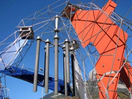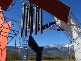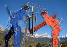 3000° Celsius est la température de fusion de la magnésie que produisait l'usine électrochimique de Chedde. L'oeuvre, dédiée au personnel de l'entreprise, représente un grand four de cuisson. Au centre, une couronne mobile de neuf électrodes en graphite, matériau également fabriqué à Chedde, surplombe une vasque en acier remplie de cristaux de magnésie. Tout autour, un réseau porteur de fils d'acier inox et trois jambages en duralinox dont les laques bleu, blanc et rouge font allusion au bicentenaire de la Révolution Française et à la date de l'inauguration de cette œuvre. Qu'elles soient animées par le souffle de l'air ou manipulées par l'homme, les sculptures de Gosselin (1924) sont toujours une quête entre rêve, plaisir et technologie.