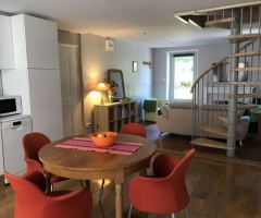Maison de caractère. Face aux Thermes. 2 studios, 2 appartements et 1 duplex (en cous de classement). Vous trouverez calme et confort dans un très beau cadre. Parc. Parking privé. Linge fourni. Accueil personnalisé. Duplex 60m2, double exposition, accès indépendant et parking couvert dans la cour de la maison. Rez-de-chaussée : grande pièce à vivre (salon /salle à manger/cuisine) 30m².1ère étage : chambre donnant sur le parc, 2 lits 90×190 (possibilité de faire 1 grand lit), salle-de-bains en suite, 30m².