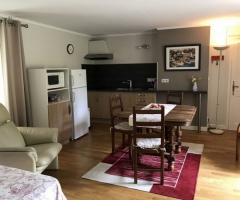 Maison de caractère. Face aux Thermes. 2 studios, 2 appartements et 1 duplex. Vous trouverez calme et confort dans un très beau cadre. Parc. Parking privé. Linge fourni. Accueil personnalisé. Studio de 32m² au rez de chaussée, appartement de plain pied. Une situation exceptionnelle dans un terrain clos, à quelques mètres des thermes.Une pièce principale avec coin cuisine et coin séjour, deux lits de 90 x 190cm. Salle de bains avec douche à l’Italienne & WC. Les deux pièces donnent sur le parc de la maison.
