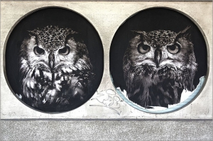 Collages de hiboux. L'idée étant d'amener les gens à réfléchir à la place des animaux dans la société.Sophie photographe, aussi appelée Sonac est une artiste française qui prend des animaux en photos et les colle ensuite, en grand format, sur les murs des villes. Elle fait cela depuis 2010. Ses collages, installations éphémères se retrouvent ainsi au détour des rues."Mon idée avec cette démarche, c'est d'amener les gens à réfléchir à la place des animaux dans la société".La collagiste a exposé dans de nombreux lieux (parc floral de Paris en 2013, cité des sciences en 2016, Musée de la Poste à Paris en 2017. Un beau Palmarès !Ici, ce sont des hiboux qu'elle fait entrer dans Moûtiers. L'artiste met en lumière une faune de moins en moins visible.Fresque réalisée en 2019 par Sonac.