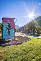 Une jeune fille sur son véloMobilités douces et transition écologique chères à la ville.Amoureux de la lettre, High produit depuis 2008 des lettrages en tout genre.Cette création illustre les mobilités douces et la transition écologique chères à la ville. On retrouve la sérigraphie caractéristique de l'auteur.Cette peinture sur plaque est installée sur le rond-point de l'Europe, point d'entrée important de la ville.Réalisée en 2021 par High