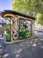 Un toucan dans sa serre exotique : décoration du mobilier urbain (toilettes publiques)Amok est peintre et sculpteur autodidacte. Il n'est pas rare de retrouver des animaux dans ses créations souvent très réalistes. Il fait partie du collectif de la Maise.Ce qui caractérise Palm, c'est l'univers très coloré et végétal.High, c'est la calligraphie son champ de prédilection.A Moûtiers, les artistes élargissent leurs champs de compétences et s'attaquent au mobilier urbain.Le but est de l'intégrer à son environnement.C'est mission accomplie avec ce toucan dans sa serre exotique. Les couleurs sont gaies et vives. La verrière est habilement représentée. Les artistes ont su jouer avec la transparence et l'architecture du bâtiment.Il aura fallu 1 jour 1/2 aux 3 street-artistes pour réaliser cette fresque.Cette œuvre a été réalisée à la bombe en 2021 par Amok, High, Palm