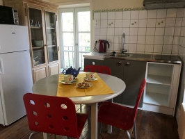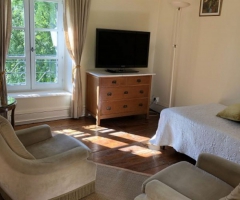 Maison de caractère. Face aux Thermes. 2 studios, 2 appartements et 1 duplex (en cous de classement). Vous trouverez calme et confort dans un très beau cadre. Parc. Parking privé. Linge fourni. Accueil personnalisé. Appartement F2 de 39m², double exposition, au 2ème étage de la maison (escalier).Séjour avec un lit supplémentaire, petite cuisine séparée du séjour, une chambre (lit de 140 x 190 cm), salle de bains avec douche et WC. Toutes les pièces donnent sur le parc.