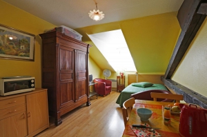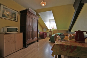 Petit studio situé au 2ème étage d'un immeuble du centre ville de Luxeuil-les-Bains. Studio bien isolé avec fenêtre à double vitrage et chauffage individuel électrique. Il comporte sur une surface de 20m² environ une belle pièce avec une kitchenette tout équipée (plaques électrique, évier en inox, four à micro-ondes, frigidaire et toute la vaisselle nécessaire). La pièce de vie propose un lit 140/190, 1 meuble de chevet et une armoire, mais aussi un coin repas avec 4 chaises, 2 fauteuils et une télévision. Enfin la salle d'eau comporte une cabine de douche, un lavabo avec un petit meuble et un wc. Studio tout équipé en appareils électriques et électroménager. Possibilité location garage. Possibilité location linge et draps. Parking proche.