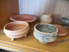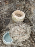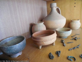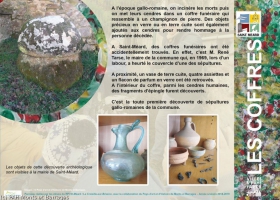 Ces 2 coffres funéraires ont été découverts en 1969 dans un champ de St-Méard en cours de labours. Ils renfermaient chacun les cendres d’un mort (probablement une mère et son enfant), car entre mi-Ier siècle et mi-IIIe siècle, on incinérait les défunts. On ajoutait, à l’intérieur et autour, des objets en verre, en terre cuite ou des éléments précieux pour les accompagner dans l’autre monde (la plupart du mobilier est visible à la mairie aux heures d’ouverture).Ensuite, les morts furent enterrés dans les cimetières voisins des églises (comme ici au Moyen Âge), avant de déplacer ces « champs des morts » vers l’extérieur des bourgs au XIXe siècle, pour des raisons d’hygiène.