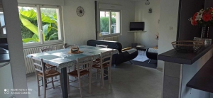 Maison plain pied, décoration moderne, 3 chambres, couchage 140, cuisine équipée, linge de lit et de toilette fournis, jardin et terrasse aménagée, parking privé, proche gare, thermes et commerces.