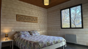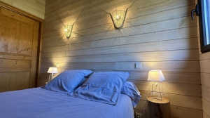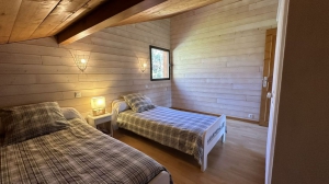 Chalet 6 couchagesRDC : grande pièce principale avec salon, salle-à-manger, cuisine équipée1 chambre lit 140 cm1 SDB avec douche à l'italienne1 WC indépendantÉtage :1 chambre lit 140cm1 chambre 2 lits 90cmÉtage ouvert sur pièce principaleÉquipement : poêle à boisfour, micro-ondes, lave-vaisselle, lave-linge, TVterrasse avec salon de jardinbarbecueLocation possible le week-end ou court séjour selon disponibilité.