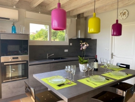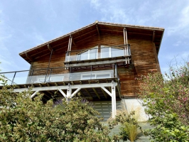 Chez Jules et Alice, sur les hauteurs en Comminges, face aux Pyrénées, vous bénéficierez d’une vue à 180° de l’Ariège au Béarn.Ce chalet atypique et climatisé de 130m2 accueille jusqu’à 6 personnes.Ce gite de charme comprend :● cuisine ouverte (micro-onde, four, plaque induction, lave-vaisselle, Senseo, bouilloire….)● salon avec canapé convertible (2 places), TV, cellier (lave et sèche-linge, fer et planche à repasser), WC.● terrasse de 7m X 3m avec salon de jardin et plancha.● A l’étage, WC, salle de bain(douche, une baignoire, 2 vasques), chambre avec lit en 140, chambre avec deux lits en 90.Lit parapluie et chaise haute peuvent être fournis sur demande.