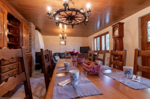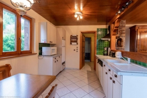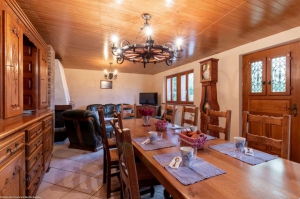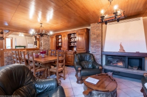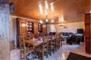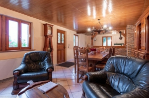 Jolie maison sur les hauteurs du village offrant une belle vue sur les paysages environnants. Au rez-de-chaussée, une grande salle à manger/salon avec cheminée à foyer fermé, TV écran plat, cuisiné équipée avec four électrique, plaques de cuisson (gaz), hotte, micro-ondes, lave-vaisselle, réfrigérateur avec congélateur, cafetière, grille-pain, bouilloire, mixeur/batteur, appareil à fondue et à raclette. Salle d'eau avec douche et lavabo, lave-linge. WC indépendant. Un garage avec frigo et congélateur complémentaire, sèche-linge. À l'étage : 4 chambres : 3 chambres avec chacune 1 lit en 140/190, 1 chambre avec 1 lit en 140/190 et 1 lit en 90/190. Une salle de bains (baignoire et lavabo) et WC. Une pièce borgne sans fenêtre avec un lit supplémentaire. À l'extérieur profitez de la terrasse semi ombragée par le majestueux sapin et contempler la jolie vue, en écoutant le ruissellement de la petite fontaine du gîte. Mobilier de jardin en bois, barbecue. Grand terrain non clos en contre-bas à disposition.Tarifs charges et chauffage compris. En hiver, pensez à équiper votre voiture.Charges et suppléments : Location de draps : 7 € par personne. Linge de toilette : 5 € par personne. Ménage fin de séjour : 70€Supplément animal : 10€/nuit