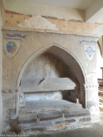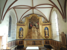 Datant des XIIe-XIIIe s., l’église a été très retouchée aux XIXe-XXe s. Parmi les éléments remarquables, la chapelle sud abrite un enfeu (niche funéraire) renfermant la tombe d’un chevalier du XIVe siècle ; avant la construction de la chapelle au XVIe siècle, il se trouvait à l’extérieur, dans le cimetière occupant alors la place. A l’intérieur, le retable (panneaux derrière l’autel) en bois doré des XVIIe-XVIIIe s. a été admirablement restauré, comme l’ensemble du bâtiment. La dépose du retable a dévoilé un important décor peint, caché derrière.2 statues se distinguent : une Pietà (XVIe s.) et saint Martin assis (XVe s.).De l’autre côté de la route, les anciens fonts baptismaux (servant autrefois à baptiser) sont transformés en fontaine.