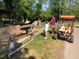 Tarifs vélos : Adulte : 6 € l'heure, 8 € les 2h, 11 € la demi-journée, 14 € la journéeEnfant : 4 € l'heure, 6 € les 2h, 9 € la demi-journée, 12 € la journéeCharrette enfant double 7€Siège enfant : 5€Sur réservation (par téléphone) - une caution vous sera demandée sur place par CB ou chèque.Rosalie : 18,50€ / heureDuo bike : 12,50€ / heureMono bike : 7,50€ / heure Vous pouvez acheter des sachets de maïs pour nourrir les animaux pendant votre baladeSur réservation (par téléphone) .