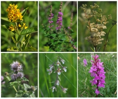 Milieu naturel qui regroupe des espèces typique de marais : - le lysimaque avec ses jolies fleurs jaunes (même famille que les primevères) - la salicaire avec ses grappes de fleurs roses - la reine des prés, connue pour ses vertus médicinales - la menthe aquatique avec son odeur fort agréableBien sûr ces milieux abritent de nombreuses autres espèces végétales, dont de nombreuses orchidées tel que l'épipactis et l'orchis des marais.Photo : Lysimaque – salicaire - reine des prés - menthe aquatique - épipactis - orchis des maraisFALC – Dans la prairie humide, le sol est mouillé. Dans la prairie humide, l’eau est cachée dans le sol. Les plantes qui poussent dans la prairie humideaiment l’eau.