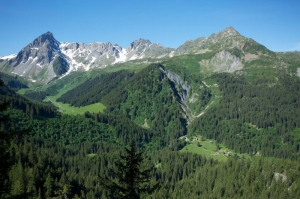 Profitez de ce belvédère naturel pour reprendre votre souffle. Mais attention le rocher est glissant et la zone non sécurisée!Vous dominez la forêt et le hameau de "Combe noire". Ce nom provient de la couverture forestière composée quasi exclusivement d'épicéas, à la couleur sombre.De ce point de vue imprenable, découvrez les alpages de la Rollaz traversés par le GR. De gauche à droite, vous apercevez les Roches rouges, les Roches franches, les Aiguilles de la Pennaz, le col du Bonhomme, le rocher du Bonhomme et enfin la Tête Nord des Fours.