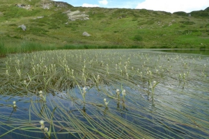 Ce que l’on voit à la surface du Laouchet, n’est pas une algue mais une plante à fleurs dont les longues feuilles étroites, telles des rubans aux reflets changeants, flottent sur l’eau. Le Rubanier vit dans les eaux calmes, froides et peu profondes des lacs et étangs de montagne. Il possède sous l’eau, des tiges remplies de réserves nutritives : les rhizomes.Avec le comblement en terre du Laouchet, la population de Rubaniers s’étend, accentuant le phénomène en apportant chaque hiver ses tiges et ses feuilles fanées