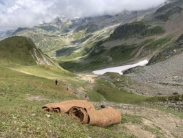 Asters-CEN74 et ses partenaires du projet Gebiodiv (PITEM Biodiv’alp) ont passé deux jours à restaurer cette portion de GR5 très fréquentée par les randonneurs du tour du Mont-Blanc.Comment restaurer un sentier dégradé ? L’équipe a récolté des graines locales, ratissé les zones à végétaliser et posé du géotextile en fibre de coco pour favoriser la pousse des graines.Aidez-nous à faire durer ce travail ! Sortir des sentiers de randonnée détruit la flore environnante. Telles des cicatrices, les nouvelles sentes favorisent l’érosion et font disparaître la végétation. Soyez vigilants ! Restez sur le sentier principal !