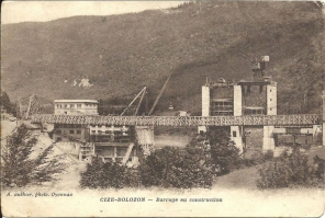 La centrale hydro-électrique de Cize-Bolozon construite sur l'Ain entre 1928 et 1931, était prévu pour l'alimentation des usines du Creusot et de Decize, le surplus pour les compagnies qui fournissait Gueugnon, Bourges, Dijon, Lyon.À l'époque de la construction du barrage de Cize-Bolozon, les sociétés d'électricité avaient chacune leurs usines, leurs lignes électriques et leurs clients. La centrale hydro-électrique de Cize-Bolozon construite sur l'Ain entre 1928 et 1931 par la société "l'Energie Electrique Rhône-Jura" était prévu pour améliorer l'alimentation des usines métallurgiques du Creusot et des houillères de Decize, le surplus étant revendu à la "Compagnie Bourguignonne de Transport d'Energie" qui fournissait Gueugnon, Bourges, Dijon, Lyon et voulait renforcer ses débouchés vers la région parisienne. Cette usine était la plus importante de la vallée de l'Ain. Actuellement sa production, comme celle de la plupart des autres usines de la vallée s'en va sur le réseau régional 63 000 V.La construction du barrage à travers une rivière aussi capricieuse qu'était l'Ain à l'époque n'a été rendue possible que par la confection d'enceintes circulaires en palplanches.Les crues nombreuses et exceptionnellement violentes du printemps et de l'été 1930 ont à plusieurs reprises noyé le chantier, mais la pugnacité des hommes a vaincu les déchaînements de la nature.Avec ses superstructures, le barrage est typique des constructions de cette époque. Sa disposition était rendue nécessaire par le type de vannes plates de 60 tonnes roulant sur des trains de chenilles, appelées vannes "Stoney".La grue imposante, aujourd'hui déclassée, est utilisée pour mettre en place les batardeaux de béton stockés près du pont et que l'on place les uns sur les autres pour former une espèce de barrage voûte devant les vannes que l'on veut réparer et qui peuvent ainsi être mise "hors d'eau". Cette grue a aussi quelquefois servi à transborder des marchandises ou de petits bateaux de part et d'autre du barrage, puisque l'Ain était navigable à l'époque
