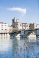 Ce monastère fondé en 838 par Barnard, archevêque de Vienne, est à l’origine de la ville de Romans. Mariage de style roman et gothique, elle abrite les neuf tentures brodées représentant la Passion du Christ (visible en saison et en visite guidée)Transformée en collégiale vers 935, l’église fut plusieurs fois détruite et reconstruite durant l’époque médiévale. Son classement au titre des Monuments Historiques dès 1840 témoigne de son importance sur les plans de l’histoire et de l’histoire de l’art.Façade occidentaleL’entrée occidentale de l’église est ornée de sculptures romanes d’inspiration méridionale qui représentent des apôtres. A droite de l’entrée, on reconnaît ainsi saint Jean avecun livre à ses pieds. A gauche, on devine le mot « PETRUS » sur un phylactère : il s’agit de saint Pierre. Les autres sculptures pourraientreprésenter saint Paul et saint Jacques le majeur. Les quatre personnages sont entourés de lions, de colonnettes et de chapiteaux au riche décor végétal évoquant l’antiquité.Mutilé pendant la Révolution française, l’ensemble a par ailleurs été entièrement remanié à une époque non déterminée.NefLa nef est composée d’éléments issus de plusieurs époques. Datées du XIᵉ siècle, les parties basses sont les plus anciennes de l’édifice. La nef est surélevée au XIIIesiècle, agrémentée d’un triforium (galerie haute) et couverte d’une voûte en croisées d’ogives.Triforium et voûtes, détruits en 1567 pendant les guerres de Religion, sont reconstruits à l’identique à la fin du siècle suivant.On remarque, côté nord, des chapiteaux historiés d’époque romane représentant des scènes bibliques (Visitation, jugement dernier) et des animaux fantastiques.Des deux côtés de la nef, des chapelles ont été fondées et décorées entre le XVe et le XIXe siècles.La grande sacristie sert d'écrin à de superbes boiseries en noyer du XVIIIe siècle et à de nombreux objets d'art sacré.Sur la tribune de l’orgue construite en 1720, on trouve un orgue signé du facteur Chambry* et installé en 1843. Il s’agit sans doute du 4e ou 5e orgue présent successivement dans l’édifice.Au-dessus de l’orgue, des vitraux installés en 2000, conçus par l’artiste Georg Ettl et réalisés par les ateliers Thomas livrent une vision moderne de l’Apocalypse de Saint-Jean.*Un facteur d’orgue est un artisan spécialisé dans la fabrication d’orguesChœur et transeptLe chœur et le transept sont érigés à partir de 1238 dans un style gothique, sur décision de Jean de Bernin, archevêque de Vienne, connu pour son action de bâtisseur. Le décorexceptionnel qui se trouve aujourd’hui dans le chœur est daté des années 1330-1350. C’est en effet à cette date que le Dauphin Humbert II, également chanoine de Saint-Barnard, cède le Dauphiné à la couronne de France, lors d’une cérémonie tenue à Romans en 1349. Dans ce décor foisonnant, on reconnaît en effet des fleurs de lys et des figures couronnées mais aussi des anges sur un chemin de ronde crénelé et des motifs végétaux et géométriques. Dans les deux bras du transept, de nombreuses traces de peinture proviennent de décors réalisés successivement du XIIIe au XIXe siècleDes expositions temporaires et des concerts ont lieu plusieurs fois par an dans cet édifice.Possibilités de visites guidées pour groupes ou individuels.En été : ouverture exceptionnelle de la sacristie et de la Chapelle du Saint Sacrement (pour voir les tentures) du mardi au vendredi ainsi que les dimanches !