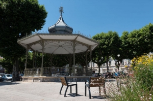 C'est sur la place Jules Nadi (promenade la plus ombragée et la plus fréquentée de Romans à la fin du XIXe) que le kiosque est édifié en 1888, les sociétés musicales ayant déjà l'habitude de donner des concerts sur cette place.La ville et ses habitants se sont enrichis grâce au développement et à laprospérité de l'industrie de la Chaussure : ce sont les voyageurs de commerce qui prennent l'initiative d'édifier un kiosque dans notre ville. Le financement est trouvé grâce à des souscriptions, une subvention municipale et une grande fête, le 2 octobre 1887. L'édification du kiosque correspond également à la commémoration du centenaire des Etats du Dauphiné et à l'arrivée en garnison du 75e régiment d'infanterie.Les travaux activement menés permettent l'inauguration le 3 juin 1888. Le 22 juillet, le Président de la République, Sadi Carnot, vient à Romans pour la pose de la première pierre du Monument des Etats du Dauphiné. Il est reçu à l'Hôtel de ville par le Maire et peut ainsi admirer le kiosque.A été restauré en 2018 et accueille de nouveau des concerts et manifestations culturelles(Le 6 du document "Parcours Romans du Moyen Age au XXIème siècle" correspond au J du plan découverte)