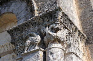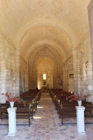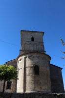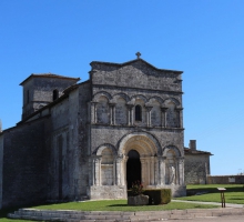 Dominant la campagne environnante à la limite du bourg, cette belle église de style roman bâtie au 12ème siècle présente un très beau décor sculpté en façade.La partie de l'édifice dédiée à Saint Martial est antérieure à 1110, mais sa façade et l'abside sont de la seconde moitié du 12ème siècle. Déjà modifiée au 13ème siècle par la réalisation d'une voûte sur croisées d'ogives au-dessus de la travée orientale de la nef, elle a été agrandie par deux chapelles latérales au 15ème siècle.La façade divisée en trois niveaux par des bandeaux, est dotée de sculptures d'une grande finesse d'exécution. Au rez-de-chaussée, entre deux arcades aveugles, le portail comporte quatre voussures. Tous les arcs reposent sur des colonnettes dotées de chapiteaux sculptés de petits personnages, d'animaux et de motifs. Au-dessus, cinq arcades aveugles, à l'exception de celle du centre percée d'une petite baie, reposent sur des colonnettes aux chapiteaux ornés de palmettes. Le pignon a été refait au 19ème siècle.La nef est voûtée en berceau plein cintre pour trois de ses travées alors que la quatrième est sur croisées d'ogives. Il n'y a pas de transept et ce sont les chapelles créées au 15ème siècle qui débordent des côtés sud et nord. Le clocher s'élève au-dessus d'une coupole sur pendentifs.