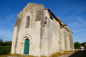 La façade renforcée à ses extrémités par deux contreforts, est percée d’une porte plein cintre, possédant encore une colonne avec un beau chapiteau orné d’un dragon. Des contreforts supplémentaires ont été ajoutés. Cette grande saillie, la présence de chapiteaux galbés permettent de faire remonter l’église à la fin du 12ème siècle.L’église possède un chœur comprenant une travée droite et une abside semi-circulaire. L’abside voutée en cul-de-four, est ouverte par trois baies en plein cintre encadrées de colonnettes à l’intérieur comme à l’extérieur. C’est sur les chapiteaux de ces colonnettes que se trouve l’essentiel de la sculpture de l’édifice. Bien que de médiocre facture, le chapiteau situé au sud de la baie axiale de l’abside est particulièrement intéressant pour sa valeur symbolique. Il y est figurée une chouette harcelée par des oiseaux. Cette représentation appartient au bestiaire roman.Le chœur se prolonge à l’ouest par une travée droite couverte d’une coupole sur pendentifs et surmontée d’un clocher moderne dont l’accès se situe dans un gros contrefort marquant l’angle sud-ouest de la travée. Cette travée délimitée par quatre arcs est ouverte au nord et au sud par une baie en plein cintre qui devait à l’origine être encadrée de colonnettes.L’arc septentrional se compose de deux rouleaux supportés par des colonnes sur dosserets, composition qui devait se retrouver à l’ouest à l’époque romane. Cette dissymétrie pourrait s’expliquer par la chute du clocher qui aurait entraîner une reconstruction partielle de cette travée mais aussi d’une partie de la nef.L’église comprend une nef unique couverte d’une voûte de pierre en berceau. Cette hypothèse est confirmée par la présence de colonnes engagées sur les murs latéraux. Ces colonnes délimitent chaque travée de la nef et correspondent à l’extérieur à des contreforts. Elles étaient situées à la retombée des arcs doubleaux qui supportaient la voûte d’origine. Elles se terminent par des chapiteaux chanfreinés dont les tailloirs se prolongent par un bandeau qui marque le départ du couvrement.Il est à noter également un décrochement des murs de la deuxième travée au sud comme au nord qui doit être rapproché de l’aspect fortement déjeté des murs de la nef. Il semblerait que ces éléments soient à rattacher à une destruction partielle de l’église, probablement à l’époque moderne due à l’effondrement du clocher et de la voûte en berceau. Nous savons en effet que le clocher a été reconstruit en 1760. Cette reconstruction marque sans doute la fin des travaux entamés des le 17ème siècle comme l’atteste le style des restaurations. C’est ainsi que les murs de la nef et de la travée droite du chœur ont été en partie remontés et consolidés par d’épais contreforts.D’autre part, les piliers marquant la limite entre la nef et le chœur ont été renforcés ainsi que l’arc qu’ils supportent. Le financement de ces travaux a pu être facilité par la proximité du château de Balzac, les châtelains ayant sans doute contribué aux frais occasionnés par la restauration de l’église. La présence d’une porte percée dans la deuxième travée de la nef en direction du château est là pour le confirmer. Cette marque du 17ème siècle se retrouve en façade avec la présence d’un cavalier sculpté en bas relief, cavalier qui pourrait être une représentation de saint Martin. Cette sculpture vient rompre la grande sobriété de la façade qui comprend un portail simple formé de deux voussures sans aucun décor. Ce portail est surmonté d’une baie en plein cintre soulignée par un cordon en pointes de diamant, seul vestige du décor roman. En effet, la sculpture pratiquement absente sur cette façade y avait autrefois sa place.Sur l’un des chapiteaux des colonnes encadrant le portail, avait été représenté un dragon. Les colonnes ayant aujourd’hui disparu nous ne pouvons plus apprécier le style de cette sculpture. Mais la sculpture n’est pas le seul élément de décoration de cet édifice qui renferme une peinture murale de la fin du Moyen Age. L’église a été recouverte d’un décor peint présent ça et là sur les murs de la nef. Mais la partie la plus intéressante de ce décor se situe sur le mur nord de la travée droite du chœur. Très endommagée, elle permet cependant d’observer plusieurs personnages ainsi que des inscriptions malheureusement illisibles. Cette peinture fait apparaître un archer tirant sur un homme à demi dévêtu attaché à un poteau. Cette scène peut être interprétée comme une figuration de saint Sébastien, patron des archers, considéré au Moyen Age comme un saint protecteur de la peste. D’autres représentations sont visibles. Nous pouvons notamment reconnaître une femme tenant une épée, des écussons et un nimbe crucifère. Cependant, une grande partie de cette peinture ayant été détruite, il est impossible de faire le lien entre ces différentes représentations.Elle était à l’origine une possession des comtes d’Angoulême. Nous savons qu’une construction seigneuriale existait dés le 12ème siècle à Balzac. Pouvons-nous pour autant faire le lien entre cette construction et l’église qui de ce fait aurait pu avoir une fonction de chapelle castrale ? Il est étonnant que l’église soit isolée de tout édifice mis à part du château du 17ème siècle. Si nous nous référons à la toponymie, nous trouvons à proximité des lieux un hameau appelé La Chapelle. S’agissait-il d’une référence à une chapelle castrale ? Le problème est délicat mais l’hypothèse n’est pas a écarter dans la mesure où l’église appartenait aux comtes d’Angoulême et qu’elle était située à proximité d’une construction seigneuriale.On y arrivait autrefois du château par une charmille qui conduisait 