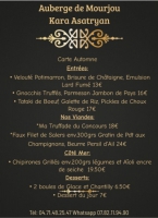 L’Auberge de Mourjou, avec son restaurant et ses chambres d'hôte, vous accueille depuis le 18 mars 2024.Menu du jour du lundi 12h au vendredi 14h.Le menu de la cheffe Kara Asatryan est le samedi midi et soir, dimanche midi. Réservation conseillée.Le menu de la cheffe, c’est deux entrées au choix, deux plats au choix et deux desserts au choix, le menu changeant toutes les 2 semaines en fonction de la saison et de son inspiration.Profitez aussi de notre terrasse ombragée pour les beaux jours.TABLE D'HÔTE GASTRONOMIQUE – UNE EXPÉRIENCE EXCLUSIVENous avons le plaisir de vous convier à une table d’hôtes intimiste, limitée à douze convives, où la gastronomie rencontre l’authenticité d’un moment partagé en sept services.La cheffe Kara Asatryan vous propose un menu gastronomique raffiné, élaboré à partir de produits de saison, soigneusement sélectionnés pour leur fraîcheur et leur qualité.Au cœur de cette expérience, chaque plat est préparé devant vous, dans un esprit de transparence et de convivialité, offrant ainsi une immersion unique dans l’univers culinaire de la cheffe.Laissez-vous guider au fil d’un voyage sensoriel, où chaque assiette raconte une histoire, et chaque bouchée révèle un savoir-faire passionné.Les réservations peuvent se faire à deux, à trois, ou en petit groupe selon vos envies, dans la limite des places disponibles.Nous vous invitons à réserver dès à présent votre place pour cette rencontre gastronomique confidentielle.Menu en 7 services à 95€Notre menu du week-end à 39€ est toujours disponible du samedi midi au dimanche midi.