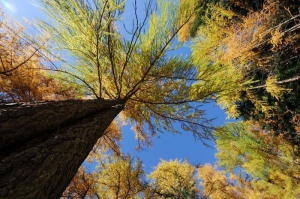 Arbre roi dans les montagnes des Alpes du Sud, le mélèze est le seul conifère à perdre ses aiguilles en hiver. Ses cônes, au printemps, sont d'un violet sombre caractéristique. Le mélèze est une des rares essences européennes imputrescibles ( qui ne pourrit pas) C'est pourquoi malgré sa torsion au séchage il est beaucoup utilisé dans les charpentes, les abreuvoirs et autres rigoles des villages montagnards. Incapable de se régénérer sous son propre sous-bois, il a besoin d'ouvertures naturelles, parfois créées par les avalanches,  pour que les jeunes pousses se développent. On le retrouve jusqu'à plus de 2200 mètres d'altitude où il adopte alors des formes naines pour survivre dans des zones dites "de combat". Le mélèze présenté en ce point de la randonnée est plusieurs fois centenaire.