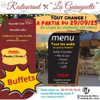 A Ebreuil, au bord de la rivière, le bar/ restaurant La Guinguette du Camping des Nières est ouvert à tous et offre un coin tranquille où se désaltérer, manger et pourquoi pas danser. Soirées concerts avec repas à thème. Diffusion des matchs (foot, rugby...). Repas tous les midis et soirs.