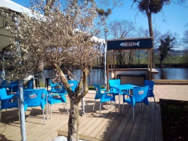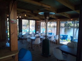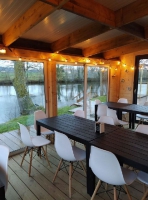 Salle de restaurant complétement fermée au bord de la Sioule, pour profiter pleinement, dès l'ouverture de la saison, des soirées un peu plus fraîches !
