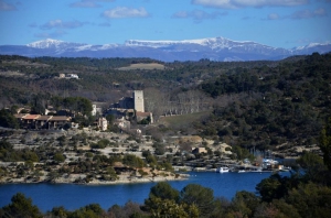 Depuis les falaises calcaires qui surplombent le lac nous avons une vue magnifique sur Esparron de Verdon et son château, on aperçoit aussi au loin le mont enneigé du Chiran qui est le deuxième sommet des Préalpes du Verdon (1 905 m) après son voisin à droite le Mourre de Chanier (1 930 m). Juste au-dessus du donjon le Grand Mourre (1898 m). Le Chiran est séparé du Mourre de Chanier par le Portail de Blieux, col de 1 595 m d'altitude.