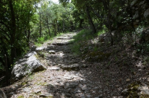 Ce chemin est assez raide. A mi-pente, une partie plate et ombragée était appréciée des ânes et de leurs maîtres qui y reprenaient leur souffle ! Sur les terres caillouteuses et pentues, aujourd’hui sauvages, ont y récoltait des amandes et des olives. Dans les safranières on cultivait le « crocus sativus » dont les stigmates (le safran) rapportaient gros.