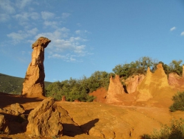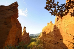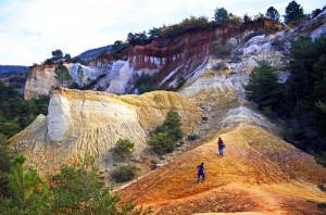 Il y a environ 125 millions d’années, une mer peu profonde recouvrait une partie de la Provence. Sur le bassin du Pays d’Apt, des sédiments marins à l’origine des calcaires blancs se déposent, bientôt recouverts par des roches argileuses (marnes grises) et des sables riches en fragments de coquilles, d’oursins et d’organismes microscopiques. Ces sédiments s’accumulent en couches obliques sur le fond marin, formant des grains verts de glauconie, une substance riche en fer. Vers -100 millions d’années, des mouvements tectoniques provoquent le retrait de la mer. Exposés à l’air libre sous un climat chaud et humide, les dépôts de grès verts subissent alors une intense altération. Les éléments comme le calcaire, les micas et la glauconie se transforment ou disparaissent, laissant place à la kaolinite, un minéral argileux, colorée par des composés de fer : un hydroxyde pour l’ocre jaune, un oxyde pour l’ocre rouge. Les grains de quartz restent majoritaires. Ainsi, le grès vert constitue la roche mère des célèbres sables ocreux du Pays d’Apt.