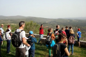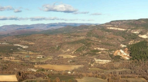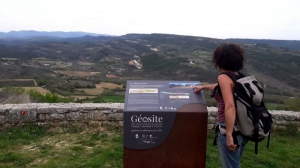 Quel magnifique panorama ! Au fond, au nord/nord-est, apparaît la Montagne de Lure (1826 m), chère à Giono. Plus proche, en contrebas, la belle entaille en forme de Z correspond aux gorges d’Oppedette où se faufile le Calavon. Puis, en contrebas, légèrement à droite, le paysage présente des couches vertes et rouges : c’est une carrière d’argile. De très bonne qualité, elle était exploitée autrefois par les tuileries de Marseille pour la céramique, la poterie ou les travaux publics. Elle est toujours en activité de manière épisodique. Ces argiles se sont déposées au fond d'un lac il y a environ 30 millions d'années.