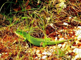 Aux abords du sentier il n’est pas rare de croiser le magnifique lézard vert. Selon certaines croyances populaires le lézard vert serait hargneux et agressif, ne lâchant plus le doigt mordu. Il est vrai qu'il peut mordre, mais uniquement pour se défendre s’il est capturé. Il pince assez fort mais n’est pas venimeux et finit toujours par lâcher prise. Il s’agit d’un animal protégé par la loi en France (arrêté du 19/11/07), il est donc interdit de le tuer, mutiler ou capturer.