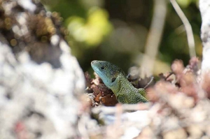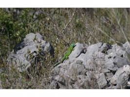 Reconnaissable à sa taille (jusqu’à 30 cm) et à sa couleur vert pomme, le Lézard à deux raies (Lacerta bilineata), autrefois appelé Lézard vert, est une espèce protégée en France, comme l’ensemble des reptiles. Sa gorge bleu vif, visible surtout chez les mâles en période de reproduction, est une de ses particularités. Il affectionne les milieux végétalisés, mais recherche aussi les zones plus ouvertes et rocailleuses pour s’y réchauffer au soleil. Son régime alimentaire se compose principalement d’insectes, de vers de terre et de mollusques.