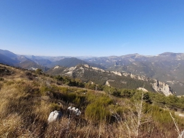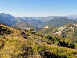 En contrebas apparaît le village des Ferres, dominé par le Mont Saint-Michel. À sa droite, en arrière-plan, se détache le village de Pierrefeu, perché sur sa crête. À l’horizon, le Mont Brune s’élève, flanqué à droite par la crête du Mont Vial, sous laquelle s’étendent les villages de Toudon, Tourette-du-Château et Revest-les-Roches. Plus à l’ouest, sur les contreforts de la montagne du Cheiron, se distingue le village de Conségudes, dominé par le Mont Saint-Paul. Lorsque le ciel est dégagé, le massif du Mercantour se dessine majestueusement en toile de fond.